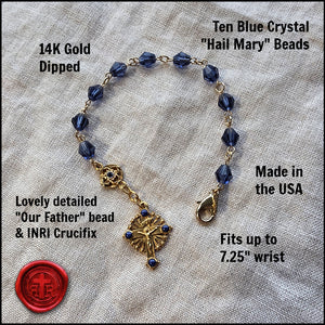 The Windows to Heaven 14K gold-dipped bracelet adds a little sparkle to your faith. It has 10 Hail Mary beads made of blue Montana crystals and a delicately detailed Our Father bead. The gold-dipped crucifix has blue accents.