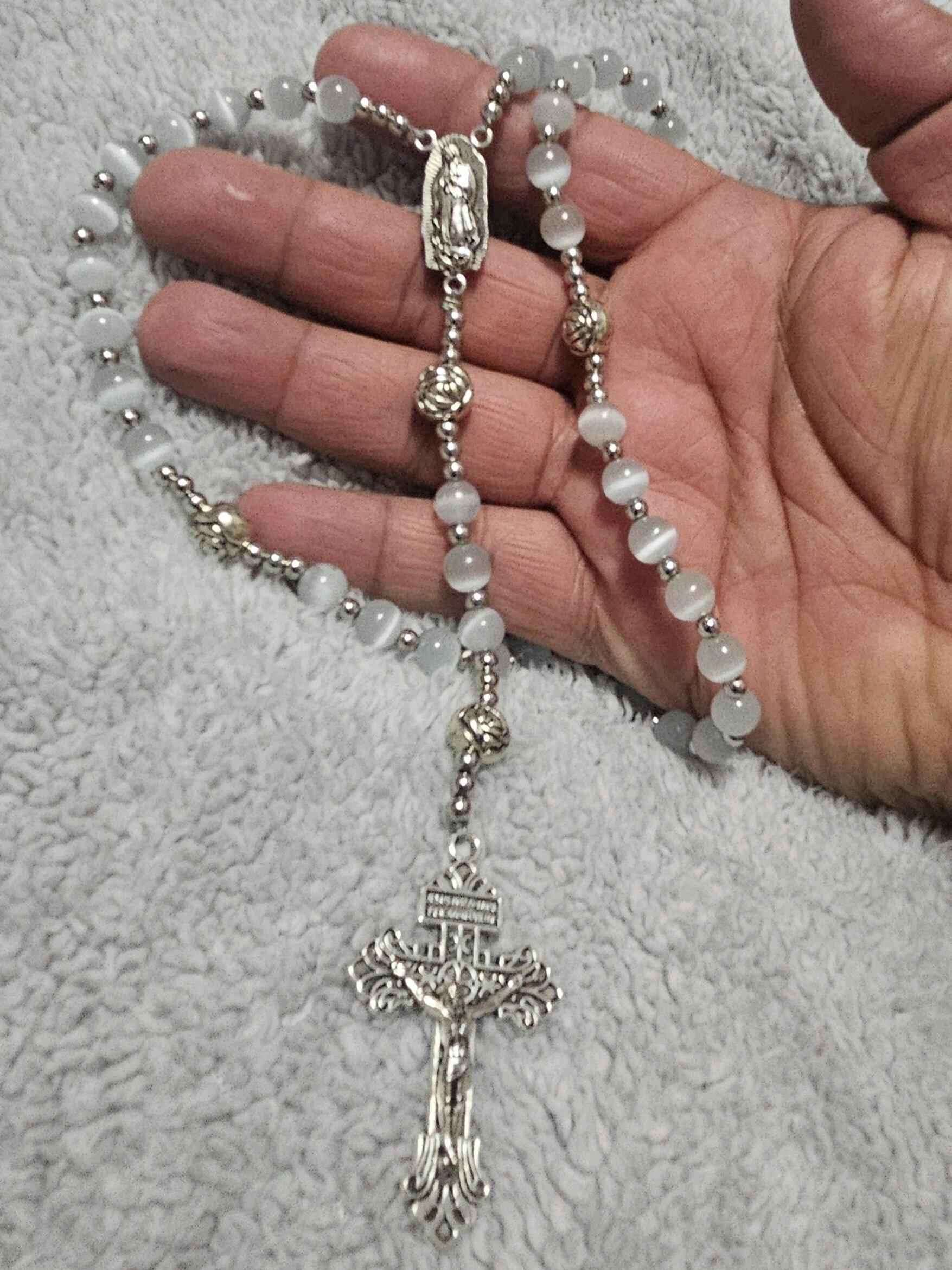 This rosary is a graceful work of art. The beautiful cat's eye rosary beads feel wonderful and weighty in your hands as you pray. Light dances and shifts through the glassy, translucent cat's eye gemstone beads as you move them through your fingers. Really stunning.