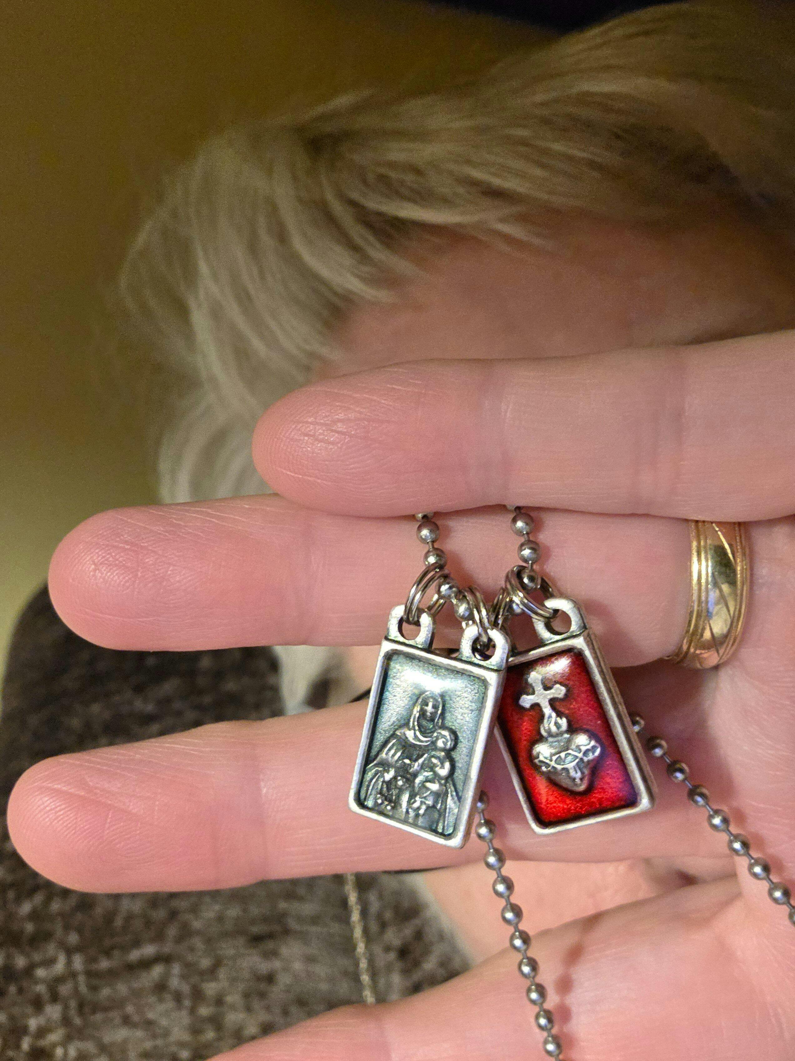 You will have Our Lady's Promise of protection when you wear this lovely but sturdy handmade scapular. This version has a 30" long stainless steel chain holding the scapular squares. The medals can be worn the traditional way with one on the heart and one on the back, or with both medals hanging together at the front.