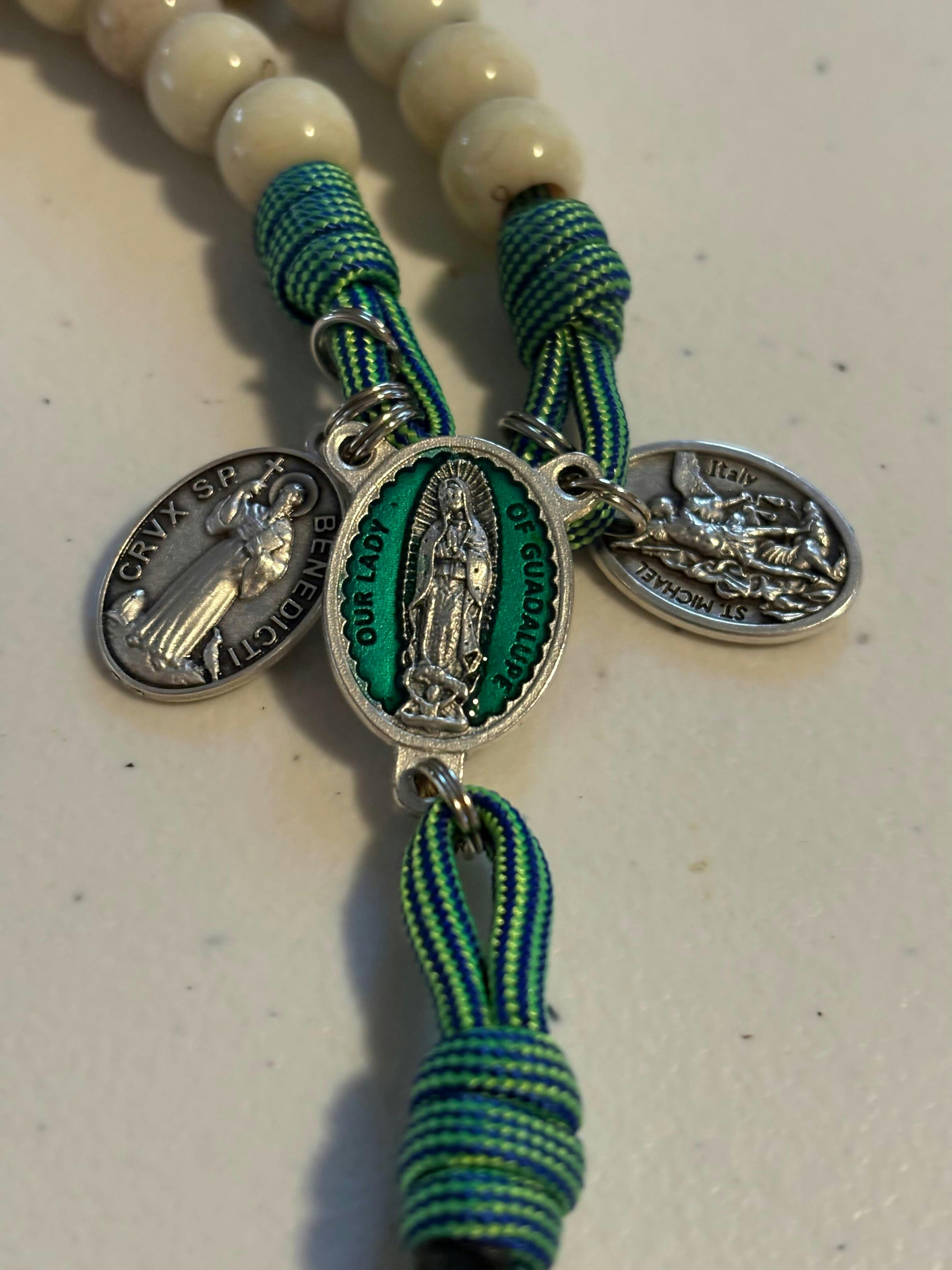 A beautiful Our Lady of Guadalupe Rugged Rosary handmade and designed by Angel and Alma, two of our expert rosary craftspersons. This rosary practically glows because of the lovely rich but translucent blue-green enamel on the centerpiece medal and the paracord with colors that shift from bluish to greenish, especially in sunlight.