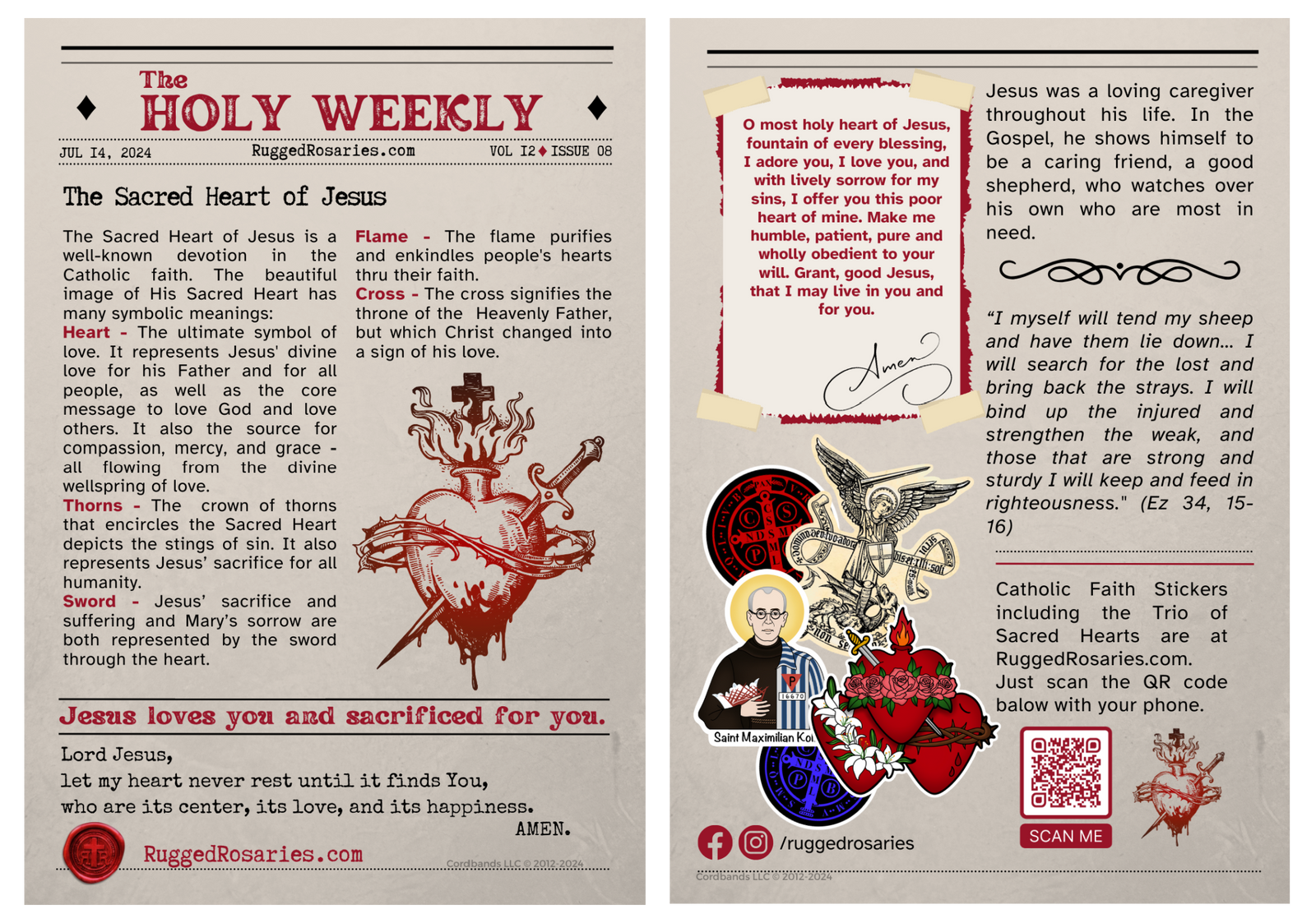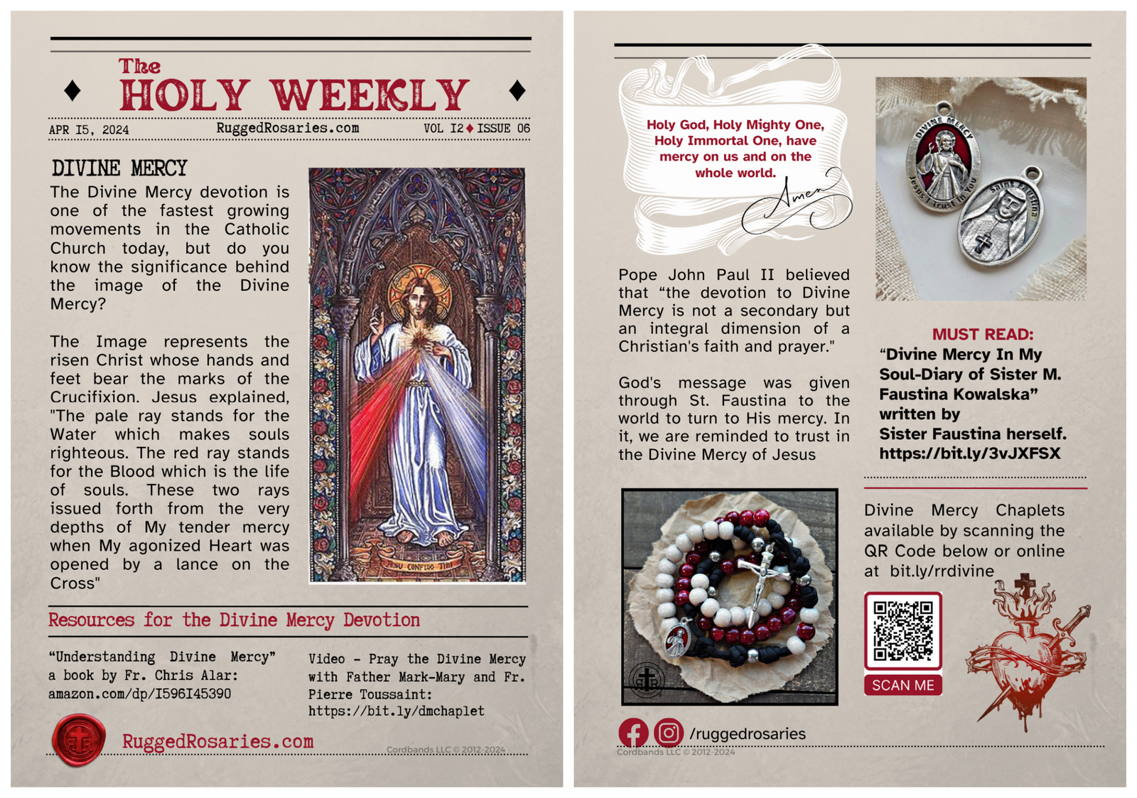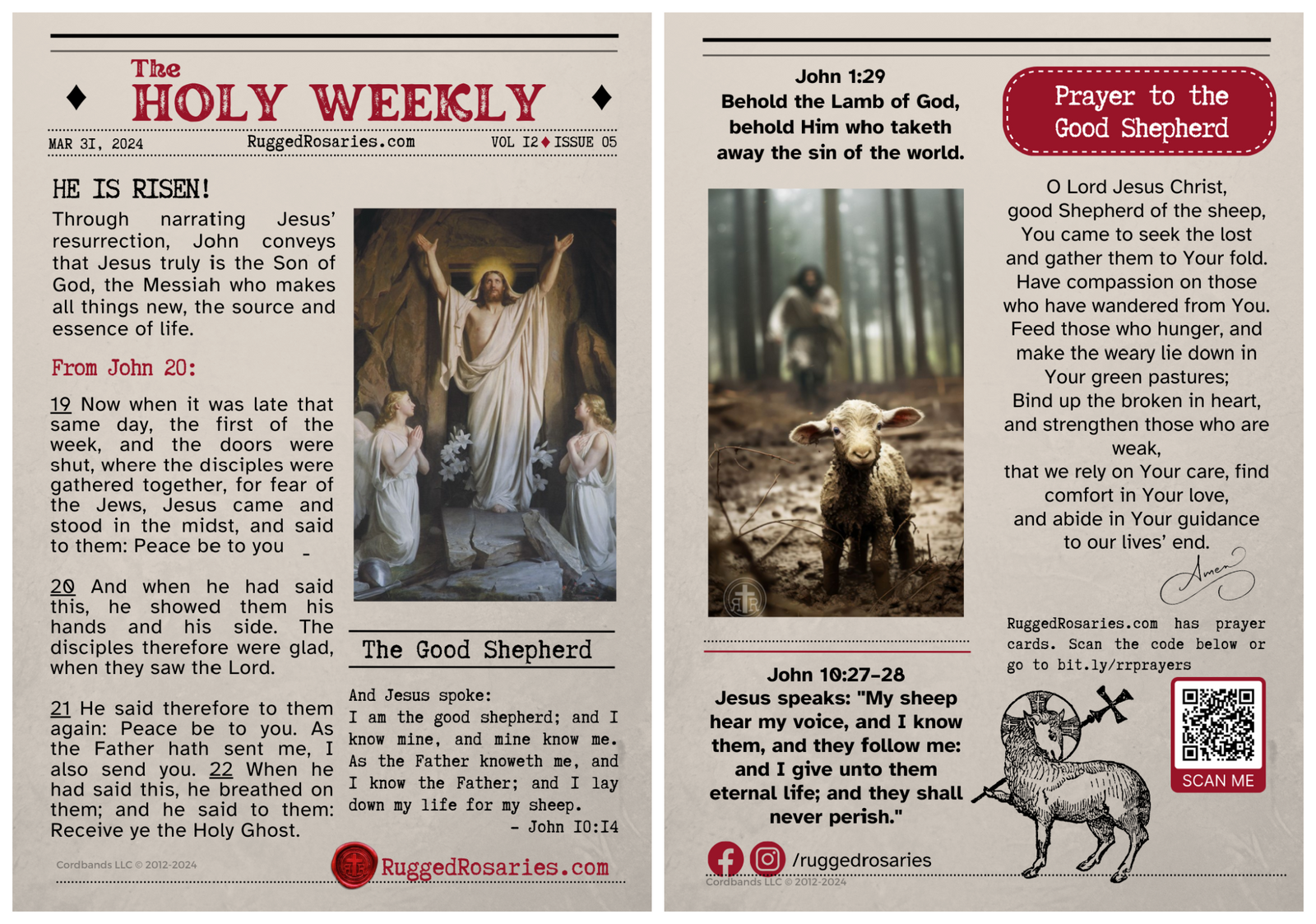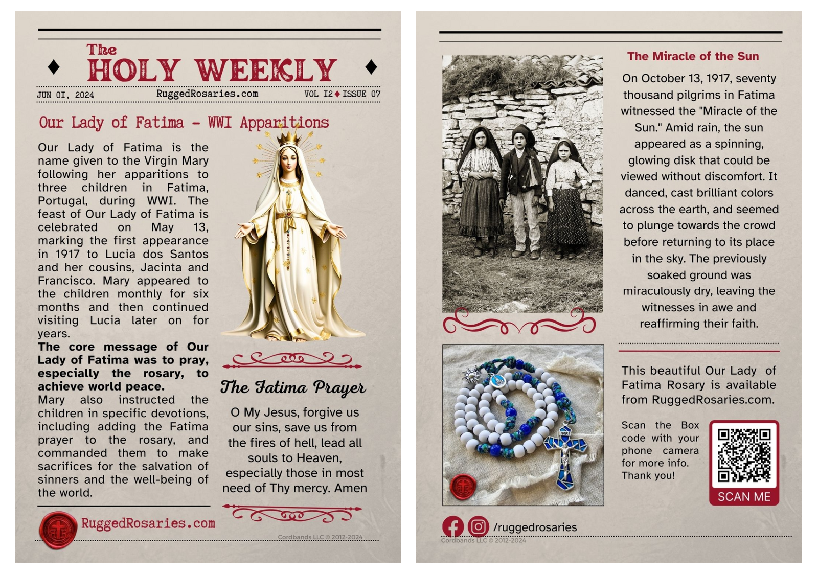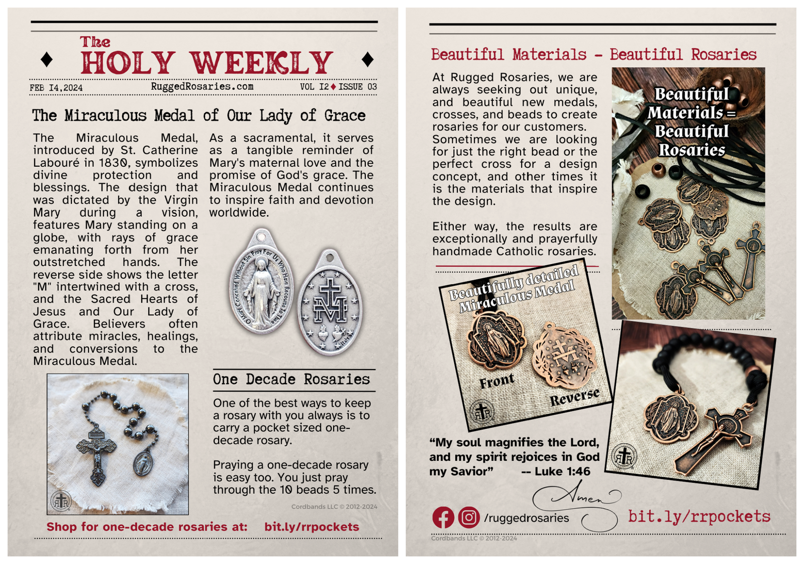 The Holly Weekly is a mini newsletter for customers of Rugged Rosaries. A Catholic newsletter in vintage style, The Holy Weekly highlights informative aspects of faith and new, seasonal, or unique products from RuggedRosaries.com. Look for your physical copy of The Holy Weekly in your shipment when you order.